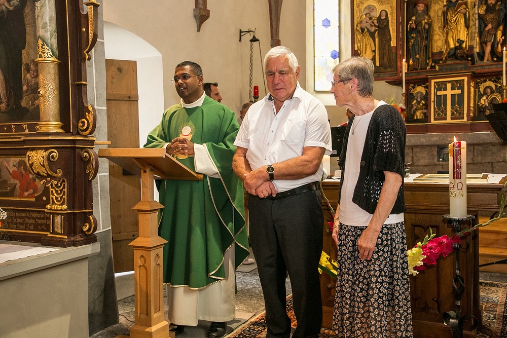 Pfarrer Lojin sprach Reinold großen Dank aus und überreichte ihm und Christl eine Urkunde mit päpstlichem Segen. Die Kirchenräte Wolfgang und Michael überreichten Reinold das Dekret von Bischof Benno und die Verdienstmedaille der Diözese Feldkirch.